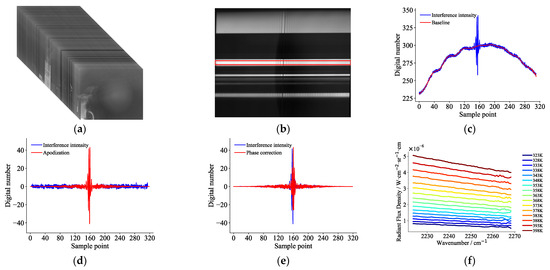 (a) Interferogram data cube; (b) interference image sequence; (c) baseline of interferometric intensity sequence; (d) apodization of interferometric intensity sequence; (e) phase correction of interferometric intensity sequence; (f) reconstructed radiance spectrum of each temperature sampling point.