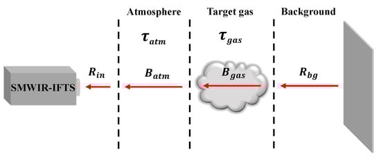 The background radiation from the third layer passes through the target gas in the second layer and the atmosphere in the first layer before reaching the SMWIR-IFTS detector. The total radiance intensity Rin transmitted to the detector can be expressed as follows: