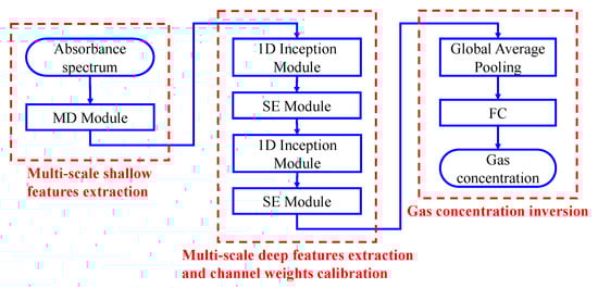 To address the limitations of traditional infrared spectral quantitative analysis methods, deep learning techniques have been applied to spectral quantitative analysis tasks to enhance feature extraction and nonlinear modeling capabilities. Convolutional neural network (CNN) is a mainstream architecture in deep learning, playing a significant role in computer vision []. For one-dimensional spectral data, using a one-dimensional CNN (1D-CNN) is more adaptable in terms of dimensionality, and the 1D-CNN structure is more compact, requiring lower hardware resources. This allows for better fitting with fewer sample requirements during training []. Fufurin et al. proposed a shallow CNN-based model for analyzing mixed gas infrared spectra, achieving precise concentration measurements of individual gas components []. Lu et al. introduced a hierarchical feature fusion CNN model, which effectively reduces spectral cross-interference in SO2-NO2-NH3 mixtures and improves the accuracy of gas concentration inversion []. Ren et al. proposed a dual CNN (D-CNN) method for spectral signal denoising and concentration inversion, achieving the accurate measurement of CH4-N2O mixed gas concentrations []. However, the 1D-CNN model still has shortcomings. Firstly, these conventional 1D-CNN models use a single kernel size for each convolutional layer, limiting the richness of the features that can be extracted, resulting in the ineffective extraction and utilization of relevant information. Secondly, each channel updates weights in the same manner, neglecting the importance differences between different feature channels, leading to the extraction of redundant and interfering features, which reduces the inversion accuracy of the model.