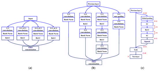 Structure of (a) MD module; (b) 1D Inception module; and (c) SE module.