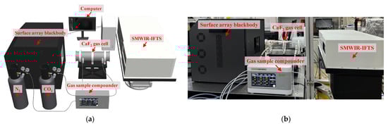 According to the principle of the three-layer radiance transfer model, a target gas detection system was built in the laboratory, as shown in Figure 7. The infrared radiation emitted by the MTB-6D surface array blackbody was used as the light source, and different background radiation conditions were simulated by controlling the temperature of the blackbody. The MH4021 multi-channel gas sample compounder was used to mix gases into a CaF2 gas cell with an effective axial length of 30 cm and a bottom diameter of 10 cm. The target gas was standard CO2 with a purity of 99.99%, and the dilution gas was standard N2 with a purity of 99.99%. The flat-field radiation light emitted by the surface array blackbody passed through the gas cell filled with the target gas before entering the SMWIR-IFTS. After completing one full cycle of scanning by controlling the scanning mirror, the interferogram data cube of the target gas was obtained.