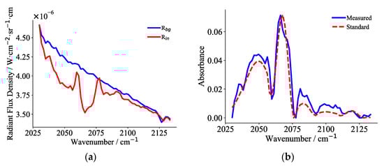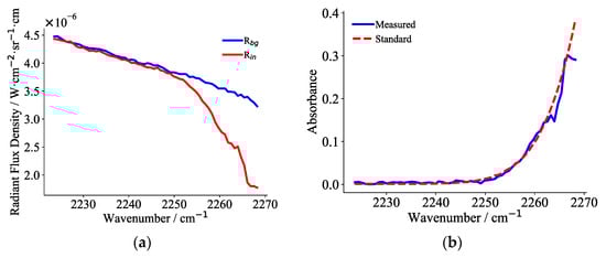 The collected radiance spectrum of the gas cell filled with N2 at 296 K is used as the background radiance spectrum Rbg, while the collected radiance spectrum of the gas cell with a specified concentration of CO2 at 296 K is used as Rin, and the radiance spectrum of a blackbody at 296 K is used as Bgas. The CO2 absorbance spectrum is then reconstructed using the three-layer radiance transfer model. Figure 8a shows the background radiance spectrum Rbg and 90% CO2 radiance spectrum Rin measured at 383 K through the 1st filter channel, with the reconstructed CO2 absorbance spectrum shown in Figure 8b. Correspondingly, Figure 9a presents the radiance spectra acquired at 408 K through the 2nd filter channel, and Figure 9b shows its reconstructed CO2 absorbance spectrum.