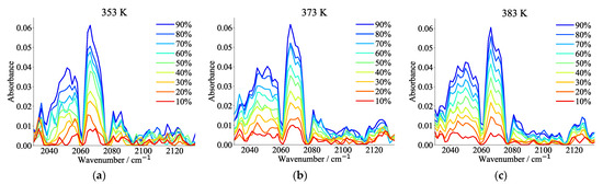 As shown in Figure 8 and Figure 9, there are obvious CO2 absorption phenomena at the spectral bands of 2037~2061 cm−1, 2061~2077 cm−1, and 2251~2268 cm−1 compared with other bands, which is consistent with the results of the Hitran standard gas database [].