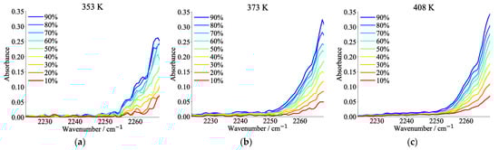 CO2 absorbance spectra collected by 2nd filter channel at blackbody temperatures of (a) 353 K; (b) 373 K; and (c) 408 K.