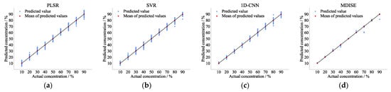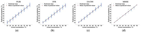 Regression prediction scatter plots of (a) PLSR; (b) SVR; (c) 1D-CNN; and (d) MDISE models in 2nd filter channel at a blackbody temperature of 353 K.