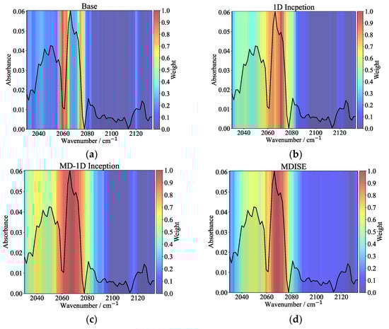 In order to more intuitively understand the gas concentration inversion mechanism of the MDISE model, the gradient-weighted class activation mapping (Grad-CAM) approach [] was used to visualize the feature weights generated by the model. The absorbance spectrum collected by the 1st filter channel is more complex than that from the 2nd filter channel. Therefore, the mean absorbance spectrum of CO2 at a concentration of 90% and a blackbody temperature of 383 K from the 1st filter channel in the test set was used as input. The feature weights generated by the Base, 1D Inception, MD-1D Inception, and MDISE models were visualized, as shown in Figure 14.