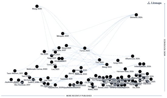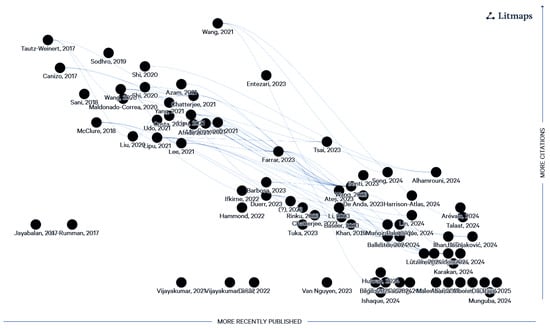 The research process involved the formulation of key questions for each content unit, which were addressed systematically. To achieve this, relevant keywords were identified and used for a comprehensive search of several document databases. The first phase of the search focused on well-known scientific databases, including Web of Science, PubMed, Scopus and Wiley Online Library, to name a few. In addition, relevant data and findings were extracted from peer-reviewed articles published by leading academic publishers such as Elsevier, IEEE and Taylor & Francis, as well as MDPI publications, proceedings of international conferences and specialized literature. In addition, supplementary information was extracted from reports from authoritative organizations such as the International Renewable Energy Agency (IRENA), the National Renewable Energy Laboratory (NREL) and various associations promoting the adoption of wind energy technologies. The Litmaps service was utilized to conduct two additional analyses. In the first analysis, the horizontal axis represented the publication year of the papers, while the vertical axis indicated the frequency of citations in other papers.