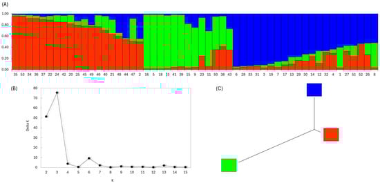 - Pritchard, J.K.; Stephens, M.; Donnelly, P. Inference of population structure using multilocus genotype data. Genetics 2000, 155, 945–959. [Google Scholar] [CrossRef] [PubMed]
