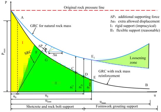 The initial tunnel support serves as the primary means of protecting against unstable surrounding rock, while the deformation allowance plays an equally crucial role by effectively reducing the rock pressure exerted on the tunnel. The Constraint Convergence Method (CCM) is widely used to evaluate tunnel convergence and determine the necessary support requirements, taking into account the complex interaction between the surrounding rock and the support system. This method is particularly effective in analyzing these factors under different geological conditions and varying stress environments [20,21,22]. CCM establishes a relationship between the internal support force (Pi) and the radial displacement (u) of a circular tunnel, providing valuable insights into the tunnel’s structural behavior under different loading conditions. This relationship is visually represented by the ground reaction curve (GRC), which characterizes the interaction between the ground and the tunnel. In addition, the support reaction curve (SRC) illustrates the elastic relationship between the longitudinal support stress and the resulting tunnel convergence. Based on crucial, albeit potentially debated assumptions, tunnel support is presumed to not alter the surrounding rock’s response. The tunnel support system is expected to achieve equilibrium at the intersection of the GRC and the SRC [23].