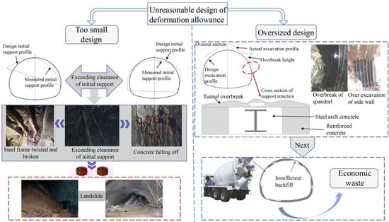 Deformation allowance refers to the designated space intentionally incorporated into engineering or construction projects to provide safe and stable flexibility, allowing for the natural movement or deformation of surrounding rock or structures without compromising their overall integrity. When determining the excavation dimensions across different rock layers, it is essential to allocate sufficient space for rock deformation, while also ensuring that the excavation meets the required construction limits and safety standards. Therefore, the deformation allowance refers to the amount of space deliberately left within the surrounding rock after excavation, ensuring sufficient flexibility to accommodate any potential deformation without compromising the stability of the structure. Monitoring the apparent displacement presents significant challenges, both in terms of difficulty and cost, due to the limitations of current construction technologies. In modern construction monitoring, deformation values are typically aligned with those of the support structure to ensure consistency and reliability in tracking structural changes. Due to limitations in measurement techniques and the interference caused by construction blasting, monitoring is generally initiated at a certain distance away from the excavation face to ensure accuracy and minimize the impact of these factors. As a result, the deformation values obtained from monitoring often reflect only a part of the deformation occurring in the support structure, failing to capture the full deformation process within both the surrounding rock and the support system. Before tunnel excavation, it is crucial to carefully design the tunnel deformation allowance. An excessively large allowance may lead to over-excavation, which significantly increases the volume of earth that needs to be removed during construction, resulting in higher costs for slag disposal and backfilling. If the allowance is set too small, it could restrict the initial support system’s intrusion and create safety risks by limiting the available space for secondary lining. A small intrusion limit may require only the replacement of the arch, potentially leading to construction delays, as illustrated in Figure 2. Therefore, it is essential to carefully determine an appropriate deformation allowance before rock excavation, and accurately predict the extent of deformations in loess tunnels to avoid such issues.