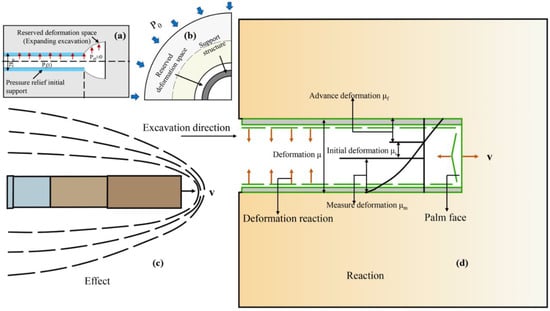 Figure 3a,b shows the spatial position of the reserved deformation amount in the tunnel and the stress on the tunnel from different angles. Figure 3c represents the tunnel shield machine, and Figure 3d represents the stress on the tunnel support and the deformation trend of the surrounding rock and tunnel face during the forward excavation process of the shield machine. The deformation of surrounding rock refers to the shrinkage deformation of surrounding rock towards the tunnel direction due to the loss of restraint after tunnel excavation. The surrounding rock deformation is crown settlement and surrounding convergence in the monitoring items. Generally, the total deformation of surrounding rock after excavation µ includes advanced deformation before tunnel excavation µf. Deformation from the excavation of the tunnel face to the beginning of measurement work µi and accumulated deformation obtained during measurement µm, as shown in Figure 3. The most reliable and available is the deformation monitoring in part 3 [27,28,29]. The deformation allowance setting includes µm and µi two parts; when the surrounding rock deformation is stable, it just reaches the position of the design contour line, so the secondary lining construction can not only save materials, but also ensure the lining quality [30,31,32].