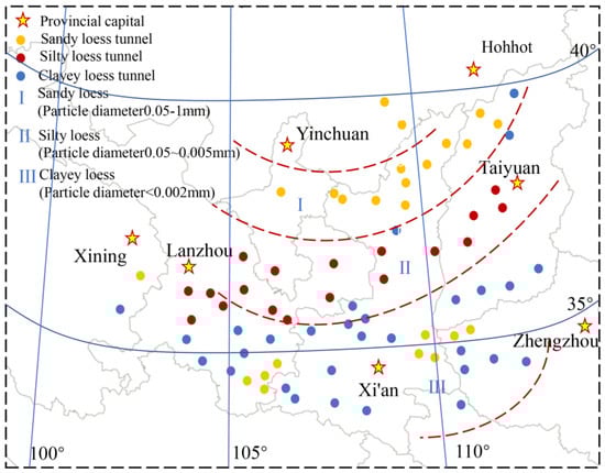 Generally, typical loess in China consists of aeolian sediments [62,63,64], supported by the following characteristics. Loess soil particles in China transition from coarse to fine and from northwest to southeast. The mineral and chemical composition of loess exhibits relative consistency across a wide area, with more significant variations observed in the northwest region compared to the southeast. In Liu [65], China’s loess is classified into three regions from northwest to southeast: sandy loess, silty loess, and clayey soil (Figure 4). Moving from sandy loess to clayey loess, there is a decrease in sand content and porosity, along with an increase in clay content and cohesion. Tunnel mechanical properties and deformation behavior vary among different loess soil types. Hence, deformation allowance design for loess tunnels of varying soil types should also differ.