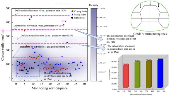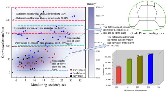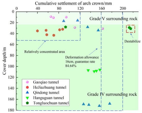 Analyzing the correlation between the loess tunnel’s cover depth and vault settlement allows for a reasonable prediction of the deformation allowance in loess areas, as demonstrated in Figure 10. At a cover depth of approximately 50 m, within a concentrated measurement area, a 16 cm deformation allowance yields an 84.6% guarantee rate. Using the Tongluochuan tunnel as an example, at cover depths of 28 m, 29 m, and 30 m, crown settlements measured were 92.97 mm, 212.97 mm, and 215.49 mm, respectively, indicating an unstable state in the section. When the cover depth of the Qindong tunnel is 28 m, the crown settlement measures 134.46 mm, while when the cover depth is 169 m, the crown settlement is 126.77 mm. It signifies the relationship between crown settlement and stratum properties, cover depth, support parameters, and construction methods. The connection between tunnel cover depth and crown settlement is not straightforward with a single parameter. Therefore, the deformation allowance for the tunnel can be determined through statistical measurements. Once the initial tunnel support is installed, the surrounding tunnel displacement stabilizes. For the control of deformation allowance, one can use the time of closed initial support as a reference. Due to data variations and the need to establish guarantee rates, deformation allowances for loess tunnels vary based on different cover depths.