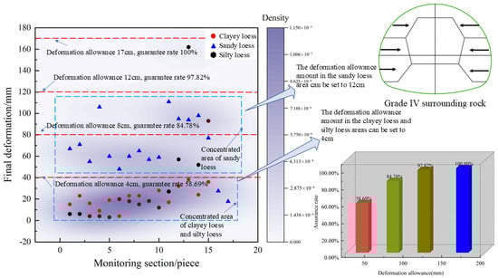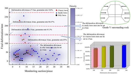 The reasonableness of the deformation allowance directly impacts the project’s economy and safety. The analysis of loess tunnel deformation and deformation allowances relies on field measurement data. By examining the variations in the surrounding rock’s grade, we are able to identify the deformation patterns and establish a range of appropriate deformation allowances. Based on varying rock levels, we can refer to specific guarantee rates (the percentage of the number of sections with initial support deformation less than the given value in the total number of statistical sections) to better align the deformation allowance with the project’s actual conditions. Furthermore, due to the complex interaction between tunnel support and the loess strata, as well as the various uncertain factors influencing the deformation of the initial support, the field-measured data may exhibit some degree of variability. To ensure that the deformation allowance aligns with site conditions, it is suitable to utilize a range value associated with a specific guarantee rate. When the corresponding guarantee rate of a given deformation allowance is greater than 80%, the deformation allowance is considered appropriate.