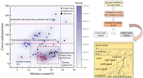 Affected by the moisture content in the loess area, the mechanical properties of the loess body can rapidly deteriorate, potentially leading to instability and posing construction safety risks. In soil tunnel construction, uncontrolled initial support clearance displacement and unstable surrounding rock complicate the determination of the tunnel’s deformation allowance. Wang et al. [69] studied the settlement and deformation mechanism of shallow buried loess tunnel surrounding rock after the increase of surrounding rock moisture content caused by rainfall. Through a large amount of on-site monitoring data, it was shown that the stress on tunnel support increased after the increase of moisture content, and the settlement of surrounding rock continued to increase. They simultaneously provided corresponding rectification measures. Shao et al. [70] classified the geotechnical environment level and immersion level of loess tunnels, and provided a calculation and analysis method for the settlement deformation of loess foundation in tunnels. Considering the structural condition of loess, the Taisha formula was used to calculate the surrounding rock pressure of the tunnel, and the relationship between the surrounding rock pressure and the structural degree of loess was obtained. However, few scholars have provided corresponding reserved deformation values for the moisture content of tunnel surrounding rock under different loess soil types. Through an analysis of 57 monitoring sections in three soil types—clayey loess, silty loess, and sandy loess—the relationship between tunnel arch settlement and water content was examined. Deformation allowance recommendations are provided. In Figure 9, moisture content primarily falls within the range of 6% to 26%, with a notably high proportion concentrated between 11% and 23%. The influence of moisture content on loess tunnels in sandy loess sections is more significant than that in clayey loess and silty loess sections. With a 10 cm deformation allowance, the guarantee rate is 64.29%, while increasing it to 20 cm raises the guarantee rate to 94.64%. Taking soil type into account, crown settlement in clayey loess and silty loess sections typically remains below 100 mm due to moisture content influence, allowing a 10 cm deformation allowance. However, in sandy loess sections, extensive cumulative vault settlement occurs due to significant moisture content effects. Therefore, tunnels in sandy loess sections should have a deformation allowance of 20 cm.
