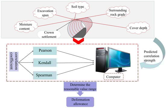 Using Python (v.3.13), we applied the three correlation coefficient methods to classify and calculate data from 148 monitoring sections. Since the crown settlement (CS) is greater than that of the surrounding convergence, it is based on the amount of crown settlement. The settlement of the vault is assessed and verified using three correlation coefficient calculation methods based on factors like soil type (ST), surrounding rock grade (SRG), excavation span (ES), excavation method (EM), moisture content (MC), and cover depth (CD), each evaluating the impact of these factors. Finally, based on the strength of correlation, Figure 11 recommends the deformation allowance range.