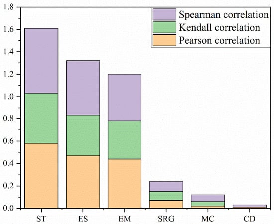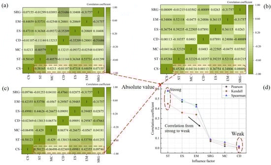 Quantitative analysis of parameter correlations in different sections of the loess tunnel is conducted through Pearson, Kendall, and Spearman correlation coefficient heatmaps. This analysis effectively reveals the complex relationships between tunnel deformation under multi-parameter conditions and the influencing factors, thereby helping to identify the key factors that control tunnel deformation. Among them, the arch crown subsidence exhibits significant deformation and is thus designated as a critical indicator. The correlation matrix between arch crown subsidence and factors influencing tunnel deformation is calculated using Pearson, Kendall, and Spearman methods, creating a heatmap that visually depicts their relationship. Figure 12a–c depicts thermal coefficient matrices for Pearson, Kendall, and Spearman correlations between crown settlement and tunnel deformation factors. The darker the color of the thermal diagram, the stronger the correlation. As shown in Figure 12d, the influencing factors on crown settlement, ranked from strong to weak, are ST, ES, EM, SRG, MC, and CD.