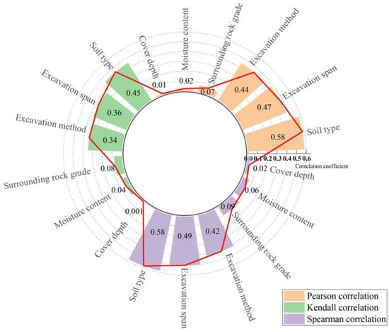 The thermal diagram and Pearson, Kendall, and Spearman correlation coefficient matrices provide statistical insights into crown settlement and its various influencing factors. This approach helps identify key factors controlling tunnel deformation and determine a reasonable deformation allowance range. Figure 13 displays the calculation results, and Figure 14 confirms the consistency of the three calculation methods. ST has the greatest impact and the strongest correlation with vault settlement. However, after the ES, MC and CD have little influence and weak correlation. Therefore, in designing the deformation allowance for the loess tunnel, it is essential to account for ST and ES influences and establish appropriate allowances based on these factors.