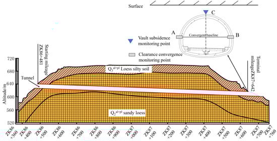 Loess in China is predominantly found in northern and northwestern regions. This type of soil is characterized by its low bearing capacity and distinct properties, such as collapsibility, large pore spaces, looseness, and the development of vertical joints, all of which influence its stability and behavior under various conditions. Support failures and collapses frequently happen in tunnel and underground construction [1,2]. Tunnel construction involves several key processes, including excavation, support installation, stress management, and deformation control, with deformation allowance being a critical aspect of the overall process. This allowance refers to the reserved space between the initial and secondary tunnel linings, which is essential for accommodating the surrounding rock and the initial support structure. Properly defining the deformation allowance prevents encroachment by the surrounding rock, ensure the total deformation of surrounding rock, and mitigates surrounding rock pressure [3,4,5]. Apart from utilizing appropriate support parameters and construction methods, comprehending tunnel deformation patterns is essential. Based on the evolution process of surrounding rock, they summarized and improved the strategies for preventing and controlling collapse. Wu et al. [6] proposed a method to solve the large deformation of tunnels under compression, and derived its reliability and feasibility based on the theory of convergence constraint methods.