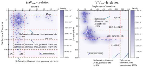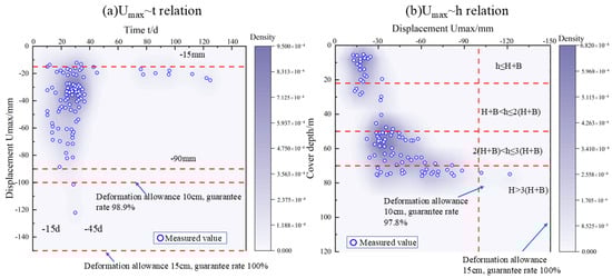 The statistical range of surrounding convergence deformation Umax is (−12.1−122.0) mm. Based on the statistical analysis of measured data, the 95% confidence interval of Umax is [−35.08, −43.39]. For tunnel cover depths h ≤ 3(H + B), surrounding convergence deformation remains below 75.0 mm, while sections exceeding this threshold are primarily found in tunnels with cover depths h > 3(H + B), as illustrated in Figure 17b. In the aforementioned analysis, the data from field measurements exhibit relatively high variability due to the intricate interplay between loess and tunnel support systems, as well as various uncertain factors impacting the initial support deformation. Hence, the deformation allowance should vary based on the vault settlement. Referring to Figure 17, the guarantee rate for crown settlement is 94.9% and 98.9% when deformation allowances are set to 15 cm and 20 cm, respectively. When the deformation allowance is set at 15 cm, the assurance rate has reached 100% in contrast. Hence, the figure analysis compares crown settlement with surrounding convergence deformation (Figure 16 and Figure 17). In the same test section, crown settlement deformation surpasses surrounding convergence deformation, emphasizing the need for deformation allowance in the tunnel to prioritize crown settlement impact. The suggested deformation allowance range for grade V surrounding rock in a loess tunnel is (−10 to −15) cm. Based on the preceding analysis, it is recommended to set the deformation allowance for tunnel vaults in grade V surrounding rock within the silty loess section to be less than 15 cm. Therefore, the validity and precision of the previous analysis are confirmed.