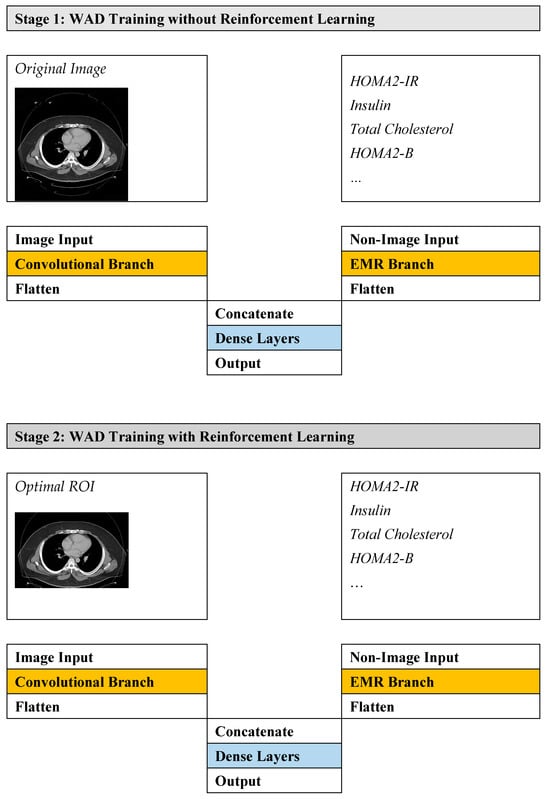 Flow chart for the wide and deep model. Legend: For the prediction of three categories for body mass index change, the wide and deep (WAD) model was trained and tested: a convolutional neural network (CNN) processes the image data; a linear layer integrates the non-image data, which consist of clinical observation data derived from electronic medical records (EMRs). In the first stage, original images were used for training and testing the Stage-1 WAD. In the second stage, optimal regions of interest (ROIs) were found based on reinforcement learning for the Stage-1 WAD, and then these optimal ROIs were employed for training and testing the Stage-2 WAD.