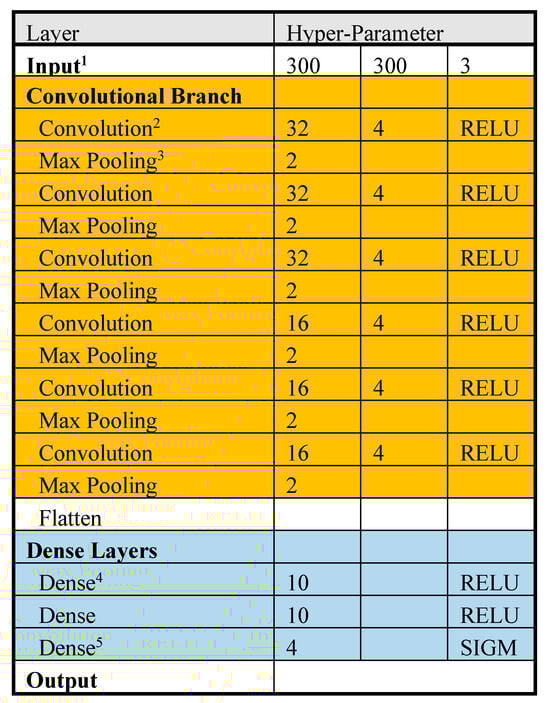 The CNN branch, which accepts the image input of the shape (300, 300, and 3), consists of six convolutional blocks, as described in Figure 2. Each of the first three convolutional blocks contains the following: (1) a convolutional layer with 32 filters of size 4 and the activation function of the rectified linear unit; (2) a max pooling layer of size 2. Each of the second three convolutional blocks includes the following: (1) a convolutional layer with 16 filters of size 4 and the activation function of the rectified linear unit; (2) a max pooling layer of size 2. The output from the last layer of the CNN branch and the linear layer containing clinical observation data (with a shape of 32) are both flattened, then concatenated, and subsequently followed by three dense layers. The first or second dense layer has 10 output neurons, with the activation function of the rectified linear unit. The third dense layer has 4 output neurons, with the activation function of sigmoid. Stata12 (Stata Corp., College Station, TX, USA, 2011), Keras 2.3.0 (Francois Chollet, GitHub, San Francisco, CA, USA, 2015), and the Lenovo ST650 V2 GPU Server were employed for the analysis during 1 January 2024–30 April 2024.