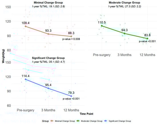 The average weight after sleeve gastrectomy over all groups was 82.3 kg (standard deviation SD 15.1). The average percentage of total weight loss (%TWL) one year after sleeve gastrectomy over all groups was 26.8% (SD 7.3). The average %TWL of the minimal change group was 19.1% (SD 2.8), while its moderate change group and significant change group counterparts were 27.3% (SD 2.2) and 35.1% (SD 4.7), respectively. Based on the results of the t-test, there was a statistically significant weight difference between pre-surgery and post-surgery in each group (p < 0.010, p < 0.001, and p < 0.001) (Figure 3). The corresponding averages of the 42 study participants were as follows: (1) 36.6 years (SD 11.02) for age, 112.4 kg (SD 19.5) for weight, and 39.8 kg/m2 (SD 4.9) for BMI; (2) 152.3% (SD 66.1) for HOMA2-B, 45.9% (SD 50.0) for HOMA2-S, and 3.2 (SD 1.5) for HOMA2-IR; and (3) 86.7 μg/d (SD 41.2) for iron and 672.7 pg/mL (SD 274.0) for vitamin B12. The respective proportions were 58% for female status, 36% for type 2 diabetes, 51% for dyslipidemia, and 22% for depression (Table 1).