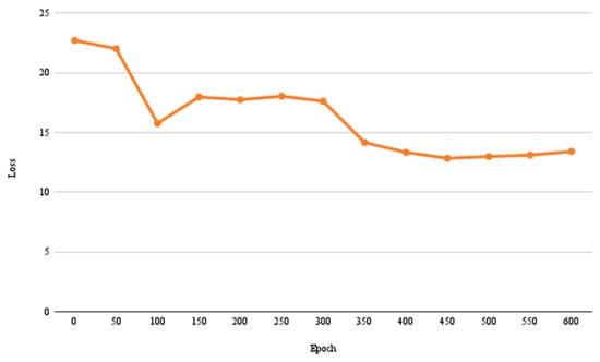 Test set loss of wide and deep learning during 600 epochs. Legend: during 600 epochs, the test set loss of wide and deep learning registered a steady fall from 23 to 13.