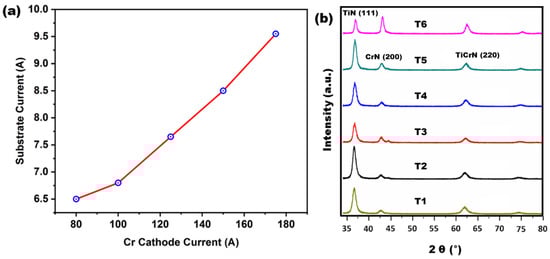 (a) Variation in substrate current at different Cr cathode currents. (b) X-ray diffraction (XRD) spectra of the deposited TiCrN coatings with chromium current variations.