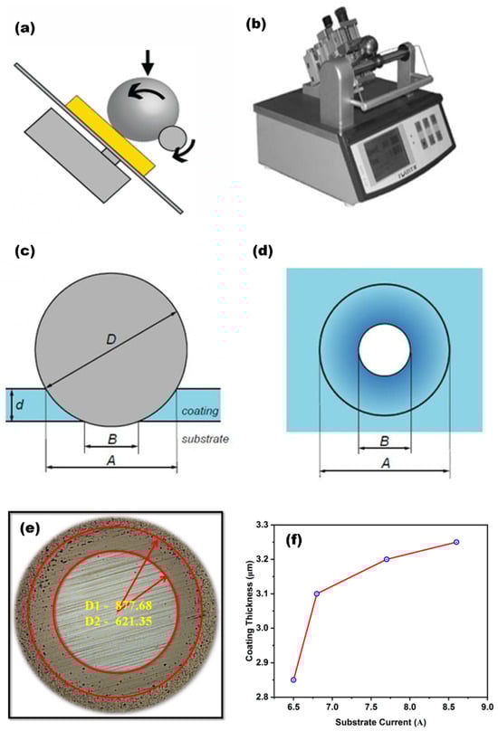 (a) Working principle of a Calo tester. (b) Image of a Calo tester. (c,d) Procedure for thickness measurement of the film using a Calo tester. (e) Image of TiCrN coating thickness measurements using the Calotte grinding measurement tool. (f) Effect of substrate current on coating thickness at fixed coating time and constant Ti current.