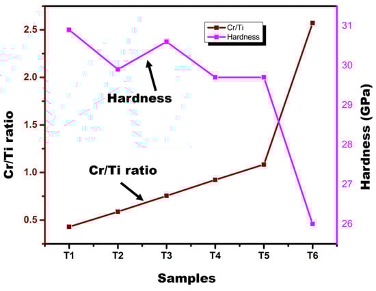 Figure 4 illustrates the relationship between the Cr-to-Ti ratio (denoted as Cr/Ti) and the hardness of all the samples. When the current of Cr increases from 80 to 175 A, Cr/Ti also increases from 0.428 to 2.571. The Cr/Ti ratio was determined to be the lowest (0.428, as shown in Table 4) for sample T1, while it was found to be the highest (2.571, as shown in Table 4) for sample T6. On the other hand, there is an opposite trend observed in the hardness of the coating surfaces. The hardness value exhibits variation between 31 and 26 GPa, depending on the chromium current employed. The literature reports the hardness values of binary CrN and TiN coatings to be 18 and 24 GPa, respectively [,]. In this case, the highest level of hardness (30.9 GPa, as indicated in Table 4) observed in sample T1 can be attributed to the existence of multiple phases, as identified by the XRD spectra displayed in Figure 1b. The XRD analysis reveals the initial presence of a single-phase material consisting of titanium nitride (TiN) with Cr substitution. Subsequently, a mixed phase of TiN and chromium nitride (CrN) is observed. Then, in the case of a higher current of Cr, Ti is introduced as a substitution in CrN. The higher concentration of the CrN phase in sample T6 is responsible for the observed lowest hardness value (26 GPa, as shown in Table 4). The reported values of these coatings lie somewhere between the hardness of TiN and CrN, as reported in the literature [,]. The XRD spectra, which shows intense peaks corresponding to CrN (see Figure 1b), clearly demonstrates this.