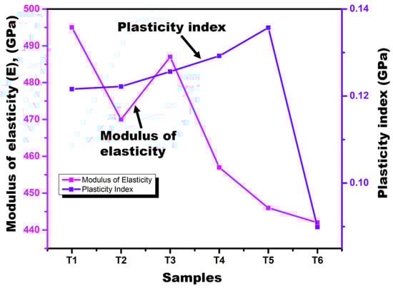 The modulus of elasticity and plasticity index of the samples are displayed in Figure 5. The elastic modulus of sample T1 was determined to be 495 GPa, which represents the highest value observed among all the samples. Conversely, the lowest value of 442 GPa was found in sample T6. The high value of the modulus of elasticity in T1 can be attributed to its higher hardness (30.9 GPa, as shown in Figure 4) in comparison to the other samples. The plasticity index, calculated by dividing the square of hardness by the cubic power of the modulus of elasticity, was observed to be the lowest in sample T6. The reason for this is because the T1 sample has the lowest values of hardness and modulus of elasticity.