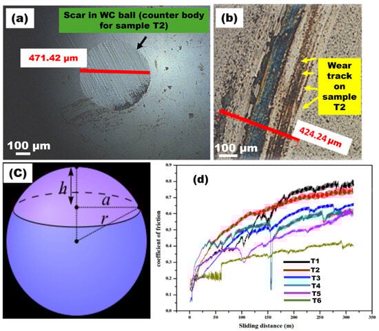 A conventional ball-on-disk machine was used to measure the COF and the sliding WR of thin films. It was observed that the coating volume loss is negligible as compared to the volume loss of the bare WC ball (counter body) [ASTM G-99]. Therefore, in the present investigation, the volume loss and WR of the bare WC ball were calculated for each set of tests to discover the better coating parameters. The scar is formed at the contact point between the sample and the bare WC ball. For sample T2, scars on both ball and sample are shown in Figure 6a and Figure 6b, respectively. The scar on the ball is like a chord cut on a solid sphere with a diameter of 471.42 µm, schematic is shown in Figure 6c. However, the observed scar on the thin film surface consists of a wear track of 424.24 µm as shown in Figure 6b. Figure 6d depicts the relationship between the COF and sliding distance for each set of coating.