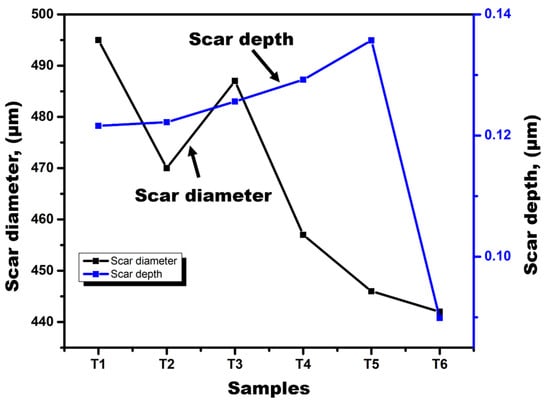 Scar diameter and scar depth of counter body (bare WC ball) used in the wear test for each sample.