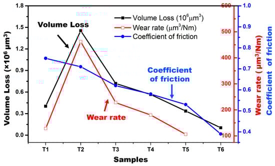 Volume loss, wear rate, and coefficient of friction of counter body (WC ball) for each sample.