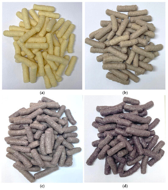 Appearance of the corn-based extruded snacks: (a) CES 0—control extruded corn snacks; (b) CES 2—extruded corn snacks with 2% BPP addition; (c) CES 4—extruded corn snacks with 4% BPP addition; (d) CES 6—extruded corn snacks with 6% BPP addition.