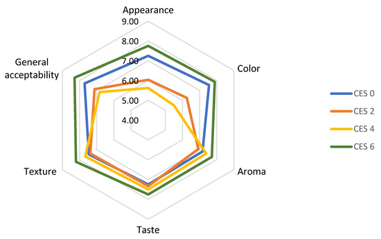 Sensory evaluation of the control and enriched corn-based extruded snacks: CES 0—control extruded corn snacks; CES 2—extruded corn snacks with 2% BPP addition; CES 4—extruded corn snacks with 4% BPP addition; CES 6—extruded corn snacks with 6% BPP addition.