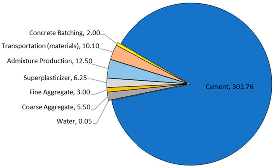 Carbon footprint distribution across different components and processes involved in the production of concrete (kg CO2 eq).