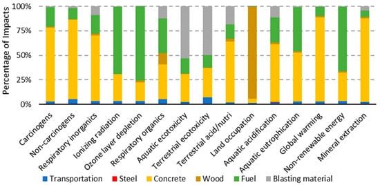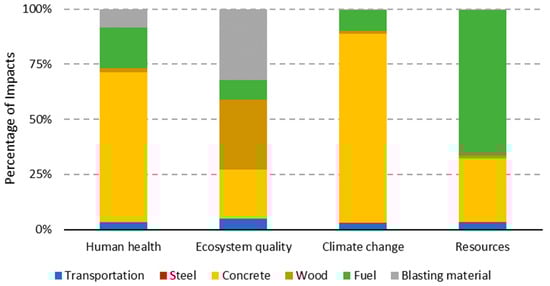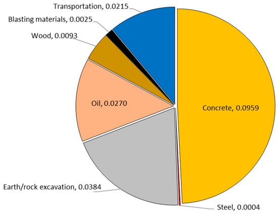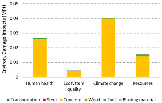 Figure 6 illustrates the impact of pollution across four categories—resource consumption, ecosystem pollution, climate change, and endangerment to human health—according to the IMPACT 2002+ methodology. The graph provides a comprehensive representation of pollution’s environmental effects by normalizing and weighting the created pollution based on its importance factors, measured in MPt (megapoints). Notably, the graph reveals that pollution generated for climate change and human health holds the top two positions, while pollution related to resources and the ecosystem ranks third and fourth. Concrete consistently emerges as the component with the highest impact in all categories, particularly in climate change, where it scores nearly 0.04 MPt, surpassing the other components such as blasting material.
