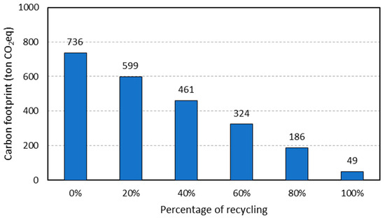 - The carbon footprint resulting from the decommissioning process, excluding recycling, was assessed using CFA and amounted to around 735 ton CO2 eq/m. The outcomes underscore the considerable influence of material recycling on the carbon footprint, demonstrating a notable 95% reduction in greenhouse gas emissions. Recycling concrete as RCA not only reduces waste and conserves natural resources, but also significantly lowers the carbon footprint by decreasing the demand for virgin aggregate extraction. Recycled steel, similarly, can be repurposed in various construction applications, promoting a circular economy approach. These practices contribute to environmental and economic benefits by minimizing landfill usage, reducing greenhouse gas emissions, and aligning with sustainable development goals.