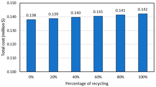 The findings indicate that the total cost for the demolition of the dam amount to approximately USD 91.6 million. In Figure 10, the impact of recycling on the total cost of dam demolition is illustrated. Notably, the inclusion of recycling concrete and steel results in an increase in the overall cost of dam destruction. For instance, if all the utilized steel and concrete are recycled, the total cost of the dam’s demolition reaches USD 0.142 million. These results emphasize the importance of factoring in both economic and environmental considerations related to waste disposal during the initial design and planning stages of construction projects. This proactive approach is crucial for mitigating adverse impacts and ensuring cost-effectiveness.