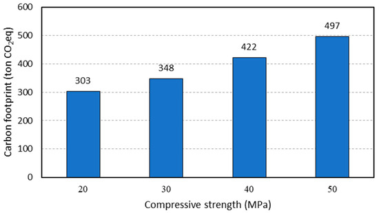 - While lower compressive strength requires more concrete, its total carbon footprint remains lower due to its reduced cement content. Conversely, increasing compressive strength reduces concrete volume, but significantly raises carbon emissions, as cement consumption is the primary contributor to greenhouse gas emissions.