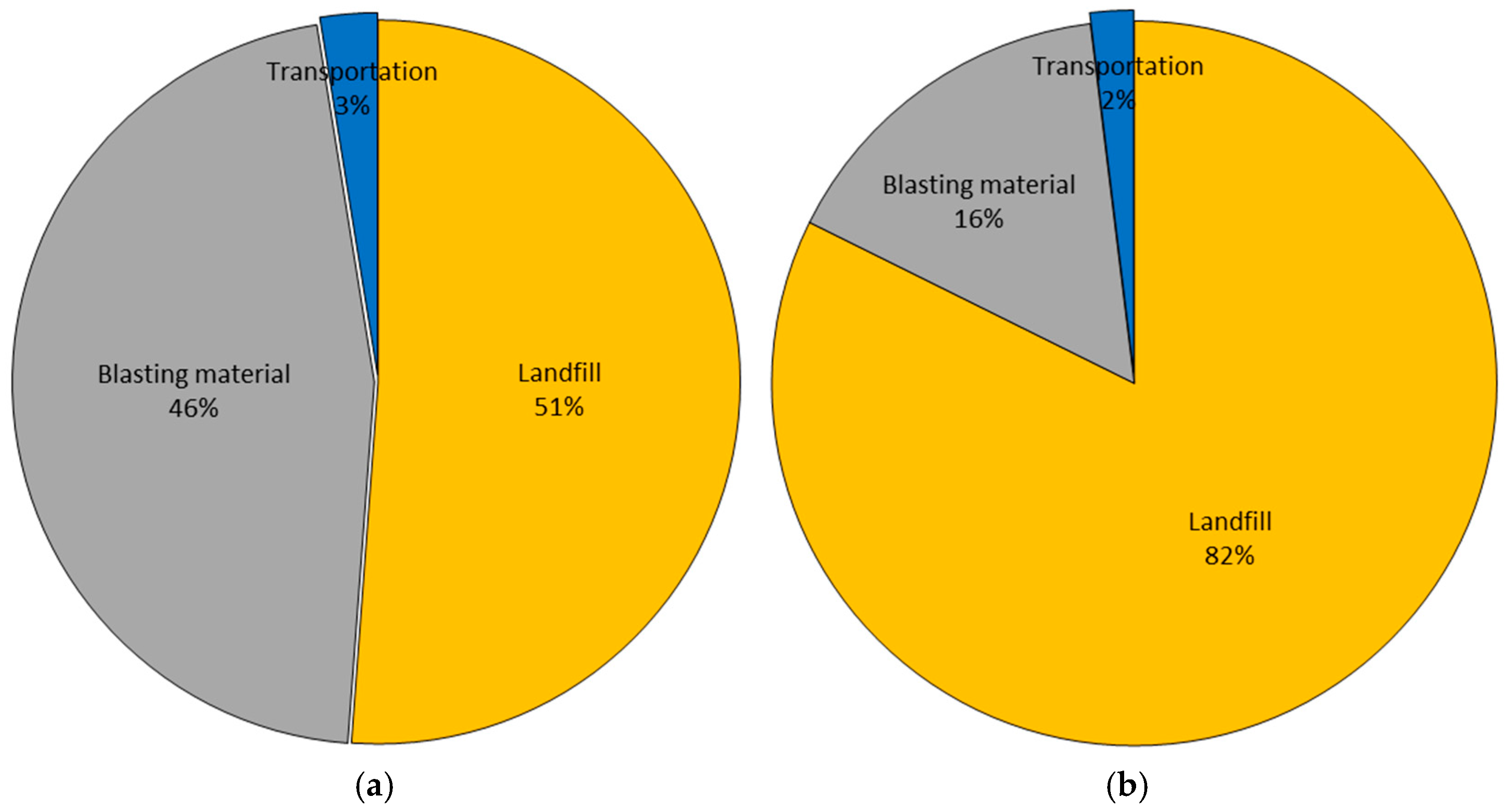 By conducting CFA and LCC analyses, the total carbon emission and cost of demolishing the 1 m width of the dam were determined to be 735 ton CO2 eq/m and USD 0.138 million, respectively. Figure 8 illustrates the contributions of the parameters to the CFA and LCC results of dam demolition. The analysis reveals that the most influential parameters affecting carbon emissions during dam demolition are landfill (51%) and blasting material (46%), with transportation accounting for 3%, influenced by landfill location. Similarly, in the LCC results, blasting material is the most significant parameter, contributing to approximately 82% of the total cost.