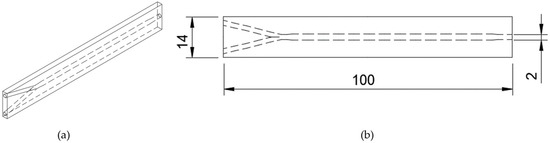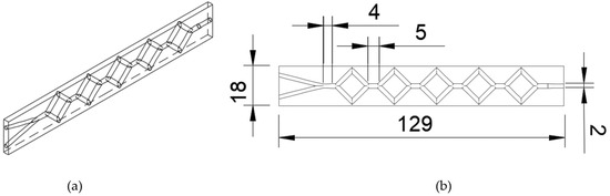 (a) Design of a millireactor with static mixers, (b) sketch of the millireactor with static mixers with dimensions in millimeters.