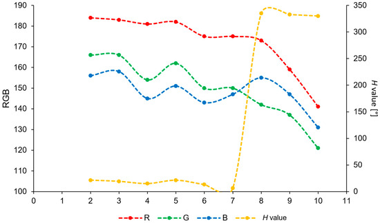For the first part of experiment, test plates coated with litmus pH sensor film with TiO2 were used. After the pH sensor films were dried, each test plate was immersed in a solution with different pH value for 5 min. The color change was monitored by photographing the plates with a smartphone and processing the images using the Color Picker AR application. The processing results were presented as RGB and hue values numerically (Table 2) and graphically (Figure 4).