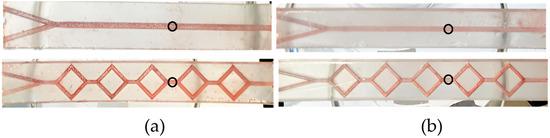 Millireactors made from (a) Anycubic Basic resin and (b) High Temp resin 300 s after the introduction of acid and base with marked points of analysis.
