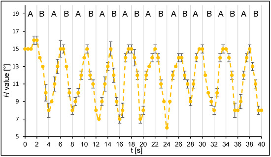 Graphical representation of the H values’ dependence on time, with error bars, in the middle of the millireactor with static mixers made of High Temp resin during cycles of alternating acid (A) and base (B) flow.