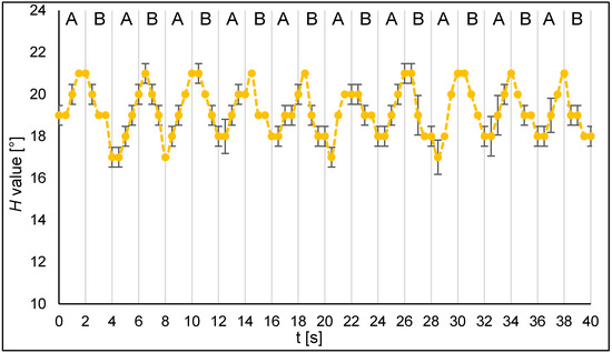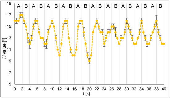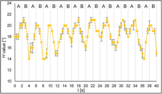 Graphical representation of the dependence of the H values on time, with error bars, in the middle of the millireactor made of Anycubic Basic resin without static mixers in acid and base flow exchange cycles ((A)—acid flow is dominant, (B)—base flow is dominant).