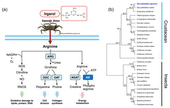 Furthermore, the role of arginine in regulating the production of reactive nitrogen–oxygen species (RNOS) within the tissue in response to irgarol exposure may influence AK expression. Previous studies have demonstrated that endocrine disruptors and heavy metal stresses are highly sensitive to innate immunity in the gill and hepatopancreas of M. japonicus [52]. Additionally, external stressors can potentially disrupt energy metabolism by disturbing the homeostasis of calcium channels in the gills and hepatopancreas of M. japonicus [26]. However, the expression patterns at the mRNA level observed in the present study confirm the molecular trends observed in response to irgarol exposure, suggesting further studies on the distribution and functional roles of AK genes in different tissues of crustaceans.