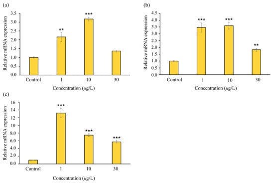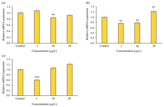 Change in M. japonicus hepatopancreas AK mRNA expression levels on days 1 (a), 4 (b), and 7 (c) after exposure to 1, 10, and 30 µg L−1 irgarol. The values were normalized against GAPDH and are presented as the mean ± SE. The expression level of the control was set as 1. Significant differences are indicated with asterisks: ** p < 0.05, *** p < 0.001.
